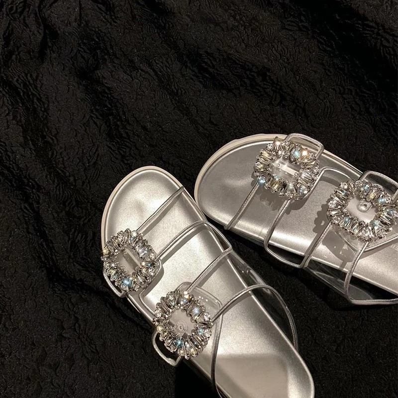 🔥 Siêu rẻ! Dép cá tính F&X mùa hè mới, dép một từ thoải mái, khóa vuông, đính đá, dây đôi, đế dày, dép đi biển cho phụ nữ, dép ngoài trời đang giảm giá!