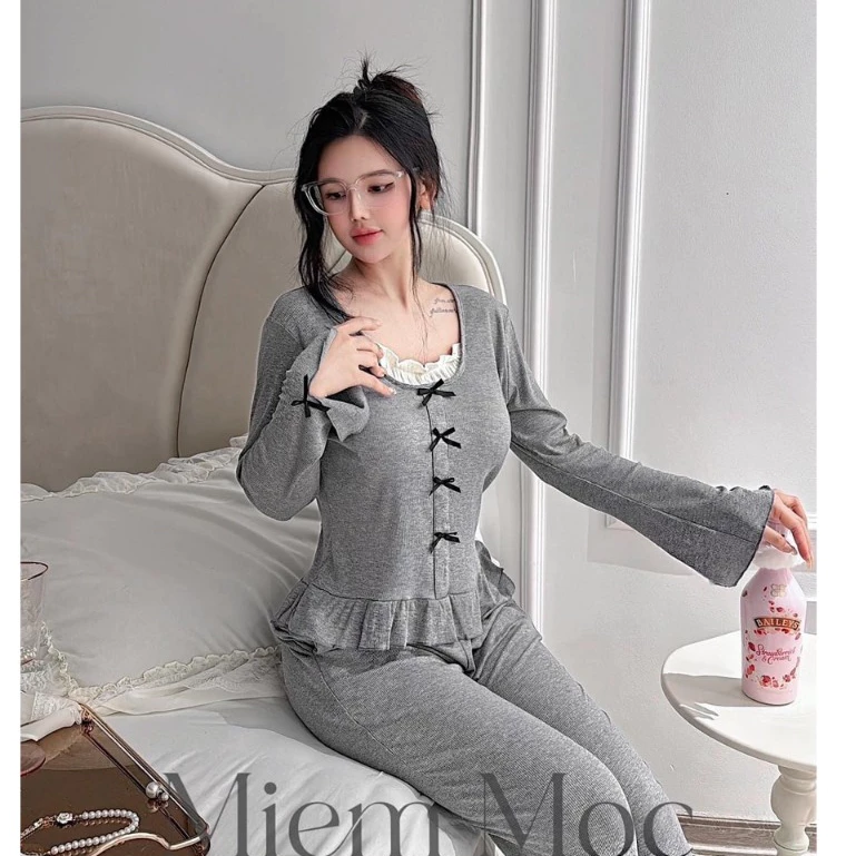🔥 Bộ đồ ngủ cotton phối nơ tiểu thư Xám Tro siêu xinh MIÊMMOC Quảng Châu cao cấp – Hàng có sẵn đang giảm giá!