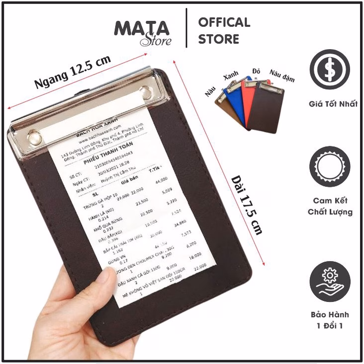 Với kích thước đa dạng A4, A5, A6, bạn có thể lựa chọn loại bìa kẹp bill phù hợp với kích thước hóa đơn của mình. Sản phẩm này cũng có giá cả phải chăng, chỉ với 95,000 VND cho một chiếc bìa kẹp bill chất lượng cao (giá gốc 121,600 VND).