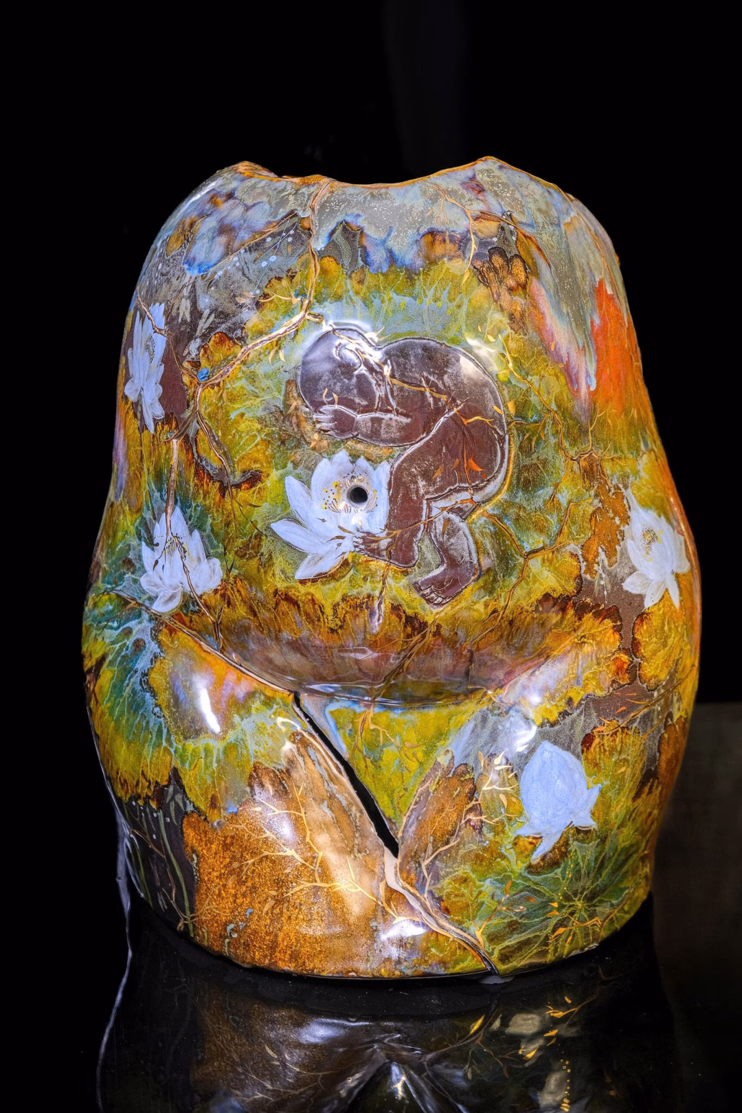 Họa sĩ Ngô Bá Hoàng chia sẻ rằng anh bị cuốn hút bởi gốm như một chất liệu nghệ thuật với ngôn ngữ biểu đạt phong phú. Mỗi tác phẩm gốm không chỉ là kết quả của sự sáng tạo mà còn là một cuộc đối thoại giữa người nghệ sĩ với lửa và đất, điều này khiến mỗi tác phẩm đều trở nên độc đáo và không thể lặp lại. Các màu men được sử dụng trong triển lãm chủ yếu có nguồn gốc từ oxit kim loại. Sau khi được nung ở nhiệt độ cao, chúng trải qua phản ứng hóa học tạo ra các sắc độ bất ngờ, mang lại hiệu ứng thị giác phong phú và thú vị.